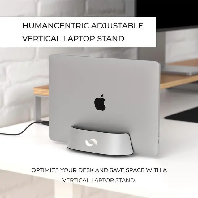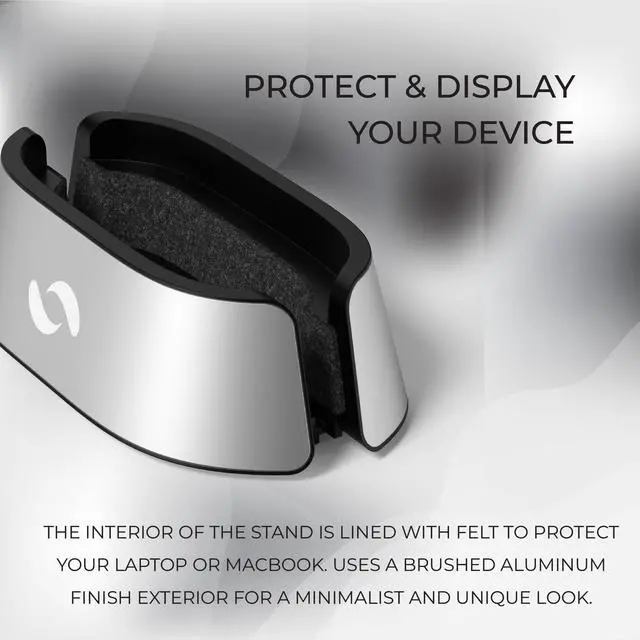 Optimize your desk with an aluminum silver vertical laptop stand: cradle and hold your laptop or MacBook in style. Save valuable desk space and protect your device from spills with a vertical laptop holder. Adapts perfectly in home offices, coworking spaces, or minimalist desk setups and it's Ideal for students, professionals, remote workers or those interested in minimal, organized, and aesthetic workspaces. ^^ The adjustable width is highly compatible and fits most laptops and MacBooks from 0.5 to 1.5 inches thick. Use the four screws on the bottom of the stand to adjust for the perfect fit. The vertical laptop stand is weighted for stability and support. ^^ Sleek and minimalist design is both functional and space-saving while adding a unique look and feel to your desk setup. The felt interior protects your MacBook stand and works with cases and covers. The high quality vegan leather exterior wipes clean. ^^ Get the full desktop experience and connect an external monitor, keyboard and mouse to your laptop, then dock your computer. For a Mac stand, use closed-clamshell mode while using your MacBook holder. Used by tech enthusiasts, designers, office professionals or anybody looking to optimize their workspace.