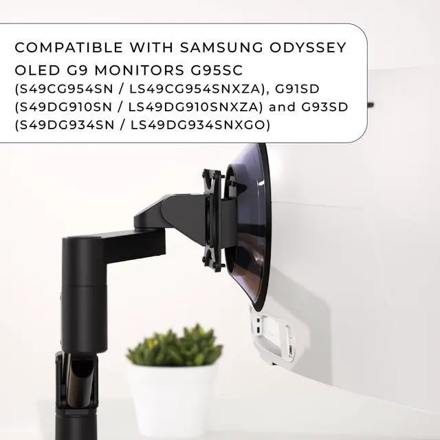 Designed specifically for Samsung Odyssey OLED G9 Monitors 49-inch S49CG954SN / LS49CG954SNXZA, S49DG910SN / LS49DG910SNXZA and S49DG934SN / LS49DG934SNXGO, this VESA mount adapter ensures a perfect fit and seamless integration with your display. It is not compatible with other brands or models. ^^ Due to the size of the monitor, this mounting bracket supports up to 32 pounds. Make sure your monitor arm supports the same weight or higher. It is compatible with a VESA pattern of 100mm x 100mm. ^^ Made of metal, this mount adapter provides reliable support for your monitor, allowing you to securely attach it to VESA-compatible arms, stands, or wall mounts.