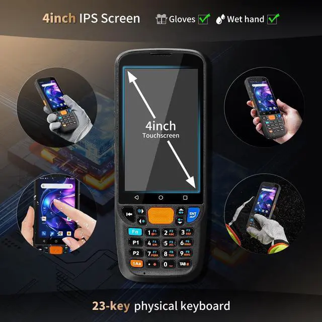 Touchscreen with 23Keys: This mobile computer outfitted with a 4-inch IPS touchscreen that remains legible in sunlight and a 23-key physical keypad. It allows for operation with wet hands and while wearing gloves, guaranteeing reliable performance even under harsh conditions. This combination offers significantly higher efficiency than touch-only PDAs, making it the perfect choice for inventory management tasks. ^^ **IP67