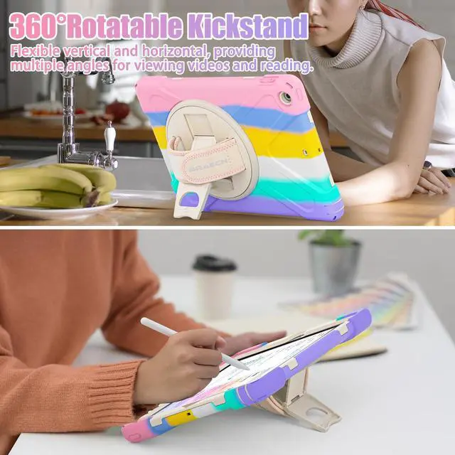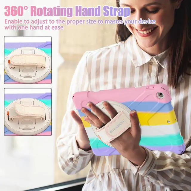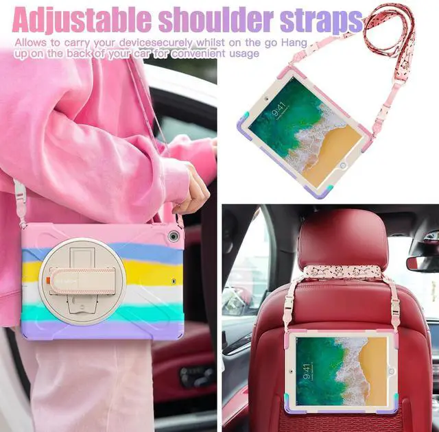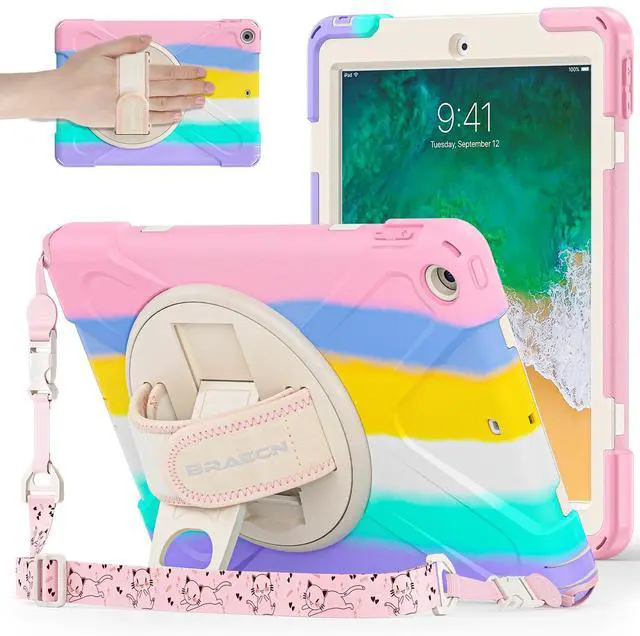 BRAECNstock Kids Case for Apple iPad 6th/ 5th Gen/Air 2/ Pro 9.7 inch Shockproof Protective iPad 9.7 inch Case with Pencil Holder, 360degRotating Stand+Hand Strap, Shoulder Strap, Colorful Pink
