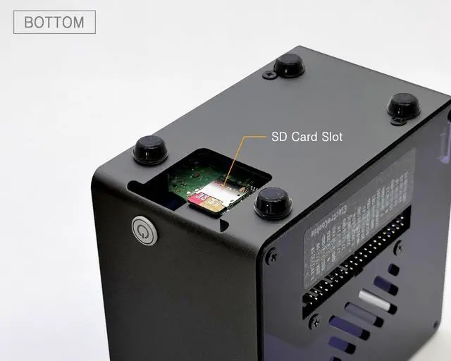 Easy Access & Soft-Touch Power Button: GPIO pins, SD card slot, USB, Ethernet, Power, and Micr