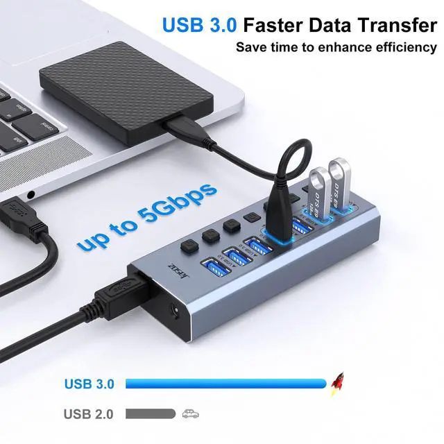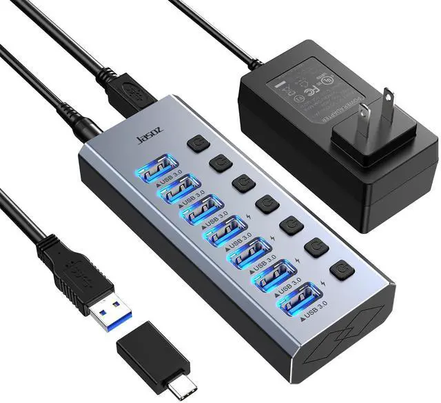 Powered USB Hub: 7-port powered USB 3.0-A hub instantly adds 5Gbps USB-A 3.0 ports and 4 USB-A smart charging ports to your laptop, desktop, gaming console, etc. Fully plug-and-play, no drivers required