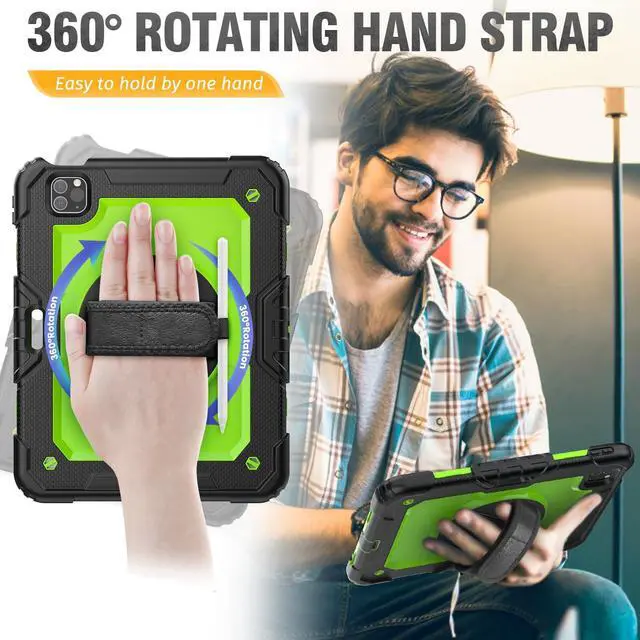 HXCASEAC Case for iPad Pro 11 Inch Case (2022/2021/2020/2018) Shockproof Design with Pencil Holder/Screen Protector/Rotating Hand Strap, Protective Cover for iPad 11 Pro 4th/3rd/2nd/1st, Green