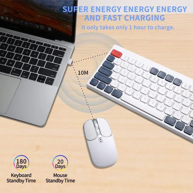 [(Rechargeable & Long Battery Life)] The Keybaord battery capacity is 200mAh, The mouse battery capacity is 400mAh, Use Type-C charging interface, it takes only 1 hour to quickly fill the battery capacity, which can be used continuously for 200 hours(laboratory test results, actual use may vary),and can easily meet the needs of a month of work. When it is not used, the keyboard and mouse will automatically use the dormant function.