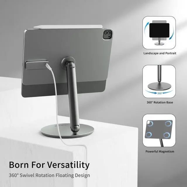 Foldable & 360deg Adjustable Charger Stand :This sleek magnetic wireless iPad stand boasts versatility! Featuring a 360-degree adjustable panel and base, this magnetic stand for iPad Pro easily adapts to various usage scenarios. The bottom stand adjusts folding angle and viewing height. When not in use, simply fold it flat for easy storage or on-the-go portability.