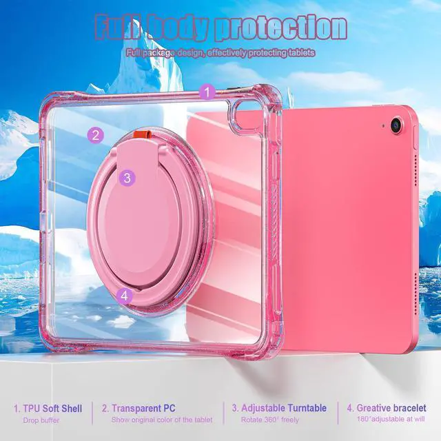 Multi-angle Adjustment & Use: The adjustable turntable can rotate freely 360deg. The large bracelet can be adjusted 180deg at will. Provides maximum multi-functional viewing angles. Easy to use your tablet in your outdoor traveling, working, gaming with kids. Hanging your tablet on the wall easy access to your favorite shows. Provide protection and convenience when you play or work with iPad