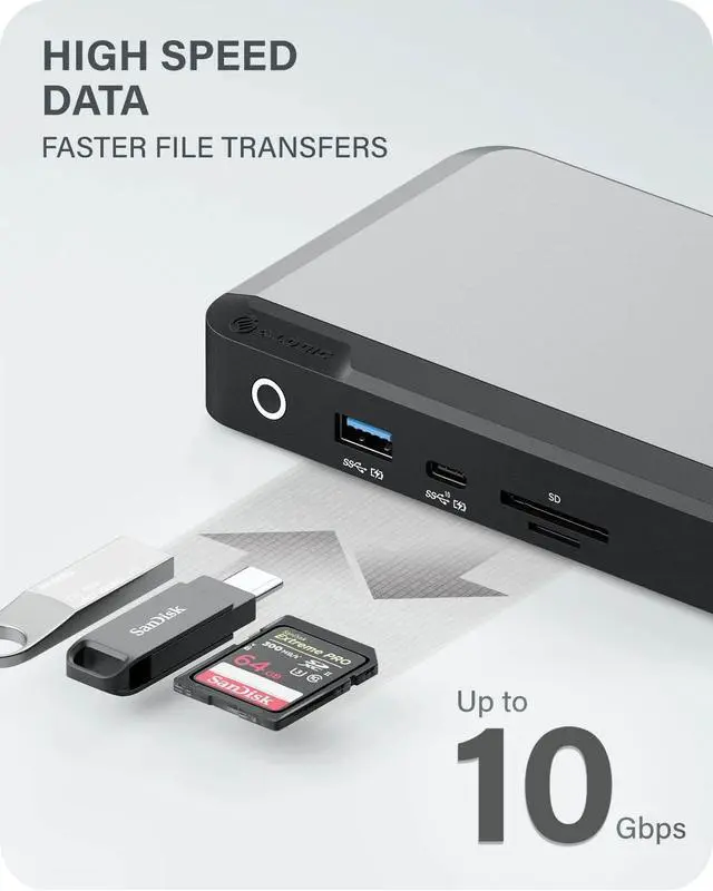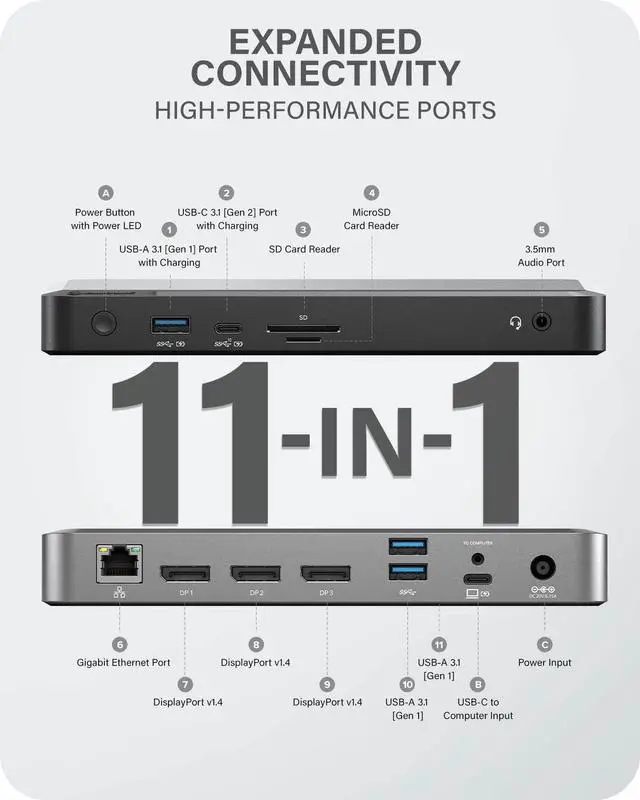 Full featured dock: ALOGIC DX3 is designed to expand the capabilities of any laptop by introducing a wide assortment of connectivity options such as 3 x DisplayPort supporting up to 4K@60Hz, 1 x USB-C 3.1 Gen 2 (10G) BC 1.2 and Apple Charging Support, 1 x USB-A 3.1 Gen 1 (5G) BC 1.2 and Apple Charging Support, 2 x USB-A 3.1 Gen1 (5G), 1 x 3.5 mm TRRS Audio / Microphone Jack, 1 x RJ45 Ethernet 1Gbps, 1 x SD Card and 1 x micro-SD/ TF card reader ^^