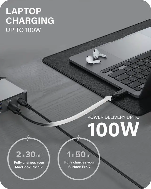 Laptop Charging: The dock charges your laptop with up to 100W of power when in use. This allows for a perfect single cable solution to add multiple displays, USB accessories, gigabit ethernet, headphone/Mic and charge your laptop all at the same time.