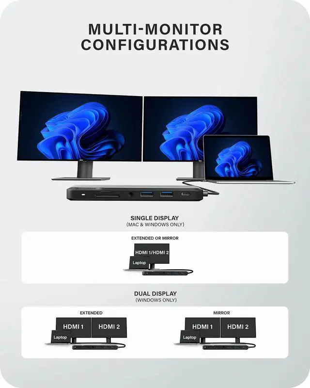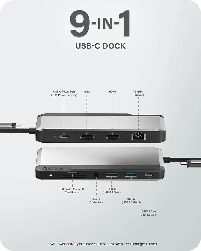 10-in-1 dock- The ALOGIC MX2 lite dock amplifies the single USB-C port of your devices into a connectivity hub by providing additional ports such as 2x USB-A, 2x USB-C, 2x HDMI ports, Ethernet, 3.5 mm audio jack, SD & micro-SD card reader. ^^ Dual Display- The docking station allows you to carry out multi-screen activities by connecting two external displays with the help of 2x HDMI ports supporting up to 4K@60Hz for single display & 1080p Full HD for dual displays. ^^ 85W Power Delivery- The MX2 lite Dock is equipped with Power Delivery technology which can charge your laptop or other devices with up to 85W of power.