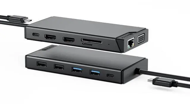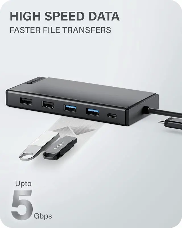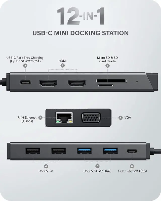 12-in-1 Hub- The ALOGIC USB-C 12-IN-1 Mini Docking Station houses ports like 2x HDMI, 1x VGA, 1x RJ45 Ethernet (up to 1Gbps), Micro SD & SD Card Reader; the dock also allows the user to connect their external accessories with the help of 2x USB-C port (USB-C#1-100W Power Delivery & USB-C#2- 5Gbps Data Port), 2x USB-A 2.0 port (480Mbps), 2x USB-A 3.0 port (5Gbps). ^^ Dual FHD Display-The Mini Docking Station allows you to connect up to two external displays with the help of the HDMI & VGA port. Both the ports can support Full HD (1920 x1080 @60Hz) display quality, on external displays that are compatible with FHD display.