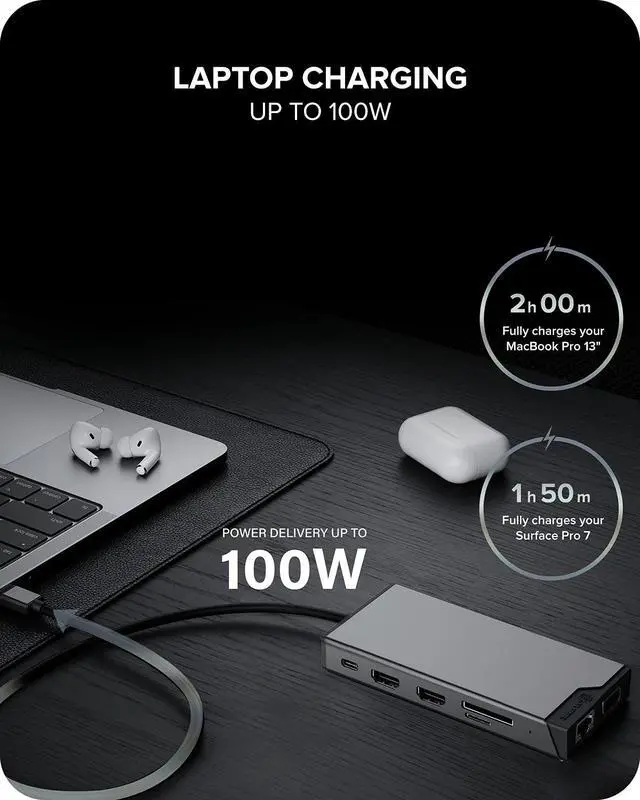 ^^ 100W Power Delivery-The 1 x USB-C PD port is inclusive of the Power Delivery technology capable of charging your USB-C enabled laptop or other devices with up to 100W (92W into charging your laptop) of power and can also transfer data at 5Gbps Speed. ^^ Universal Compatibility- The ALOGIC 12-in-1 USB-C docking station is compatible with Mac, Windows, or Chromebook devices. It is suitable with all the modern laptops like 2020 M1 MacBook/ MacBook Pro/ MacBook Air, 2019/2018/2017/2016 MacBook/ MacBook Pro/ MacBook Air; Microsoft Surface laptops; Google Pixel Book; Google Slate; Asus ZenBook; and many more.