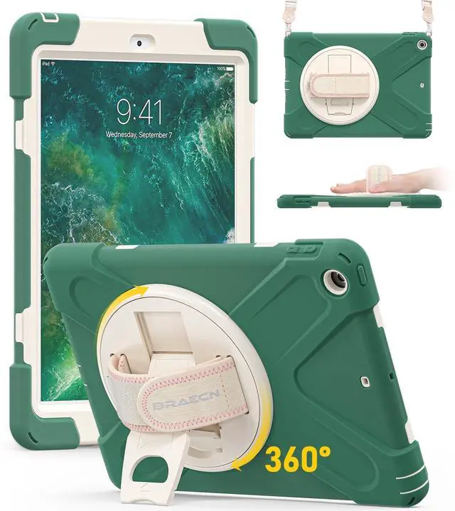 BRAECN for iPad 5th/6th Generation Kids Case, iPad 9.7 Inch Case 2018/2017, Shockproof Heavy Duty Protective Case with Adjustable Hand Strap, Rotatable Kickstand, Carrying Shoulder Strap-Emerald Green