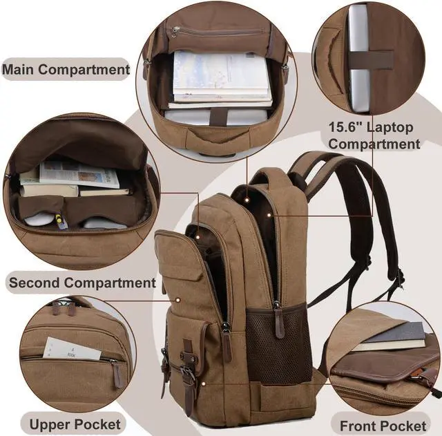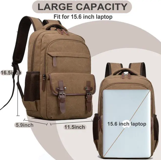 [(Multiple Pockets)] :This canvas Laptop Daypack has 1 front pocket,1 upper zipper pocket,2 side pockets and 2 large ample compartments: 1 compartment with 2 small organized slots inside, 1 compartment with laptop sleeve and 1 zipped pocket. Multiple compartments and pockets to keep your everyday essentials and small accessories.Perfect Dimensions: 16.5 x 11.5 x 5.9 inches