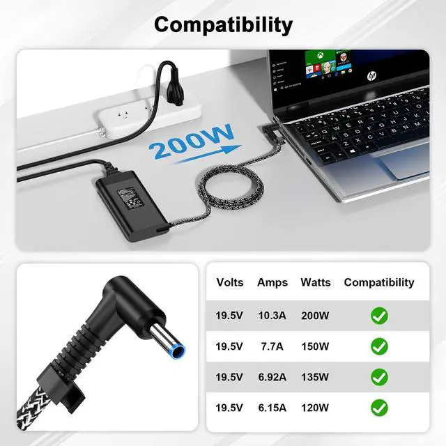 [Specification] Input: Output: 19.5V~10.3A 200W (Compatible with 150W 135W 120W) Input: 100-240V ~ 50-60Hz DC connector: 4.5mmx3.0mm Blue Tip Charger Extra Long 12 Ft Power AC/DC cords,Please confirm the specifications and plug size before purchasing!
