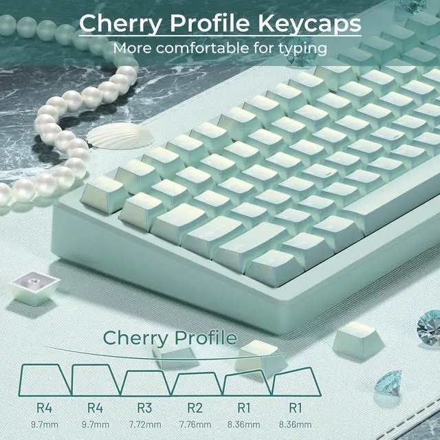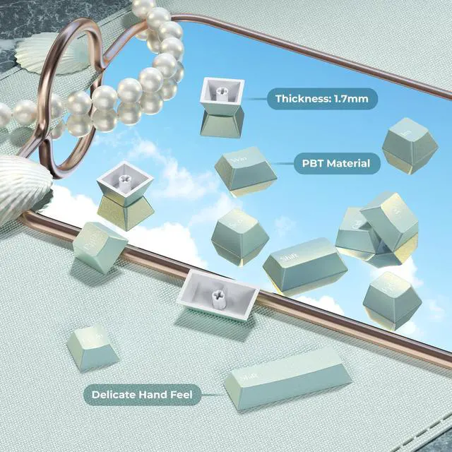 [(Pearlescent Magic Keycaps)] The pearl keycap show a unique pearl effect in the light, as if the tears of a mermaid princess become pearls, and the gloss is very high. At different angles, the reflection of the keycap will have different effects, such as a foggy highlight effect from the side, and a cold white from the front. This custom keycap is not only gorgeous, but also makes the keyboard look more high-end.