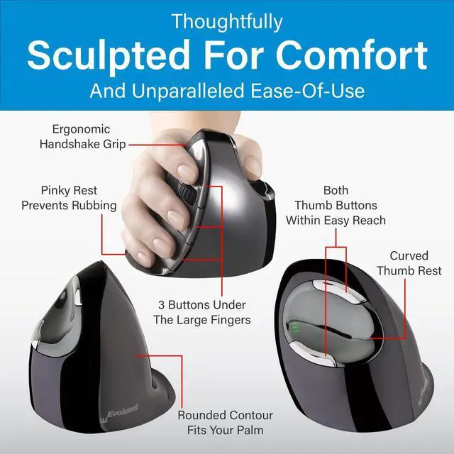 Evoluents Vertical Mouse remains a standout choice as a thoughtfully designed, precision product that offers unparalleled comfort, user-friendliness and functionality, backed by over 30 years of Vertical Mouse expertise of its designer.