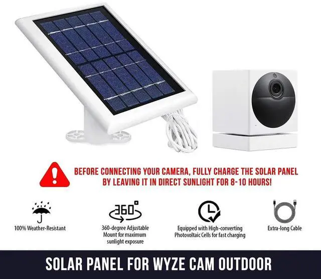 COMPATIBLE WITH WYZE CAM OUTDOOR - Our Wyze outdoor camera solar panel ensures that your camera never runs out of battery. ^^ IMPORTANT NOTE - For First time use, fully charge the wyze solar panel before connecting the camera. The charging process only begins when the solar panel is fully charged. ^^ VERSATILE MOUNTING - Our unique 360-degree wall mount allows you to easily position your solar panel in the best direction, ensuring maximum sunlight exposure. It comes with a 13.1 ft/4m cable for convenient mounting. ^^ WEATHERPROOF DESIGN - The soft PVC patent pending design micro-USB head expands slightly when inserted into the opening of the camera, thereby effectively sealing it from moisture.