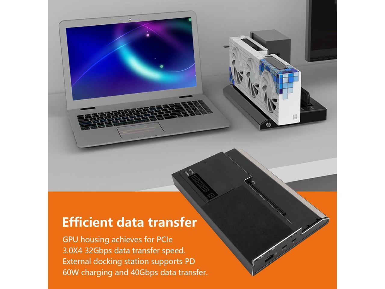 Performance Enhancement: Our external GPU dock supports PD 60W charging and 40Gbps data transfer, compatible with for PCIe x16 GPUs, featuring 2 x TB3 ports, gigabit RJ45, and for M.2 NVMe SSD slots.