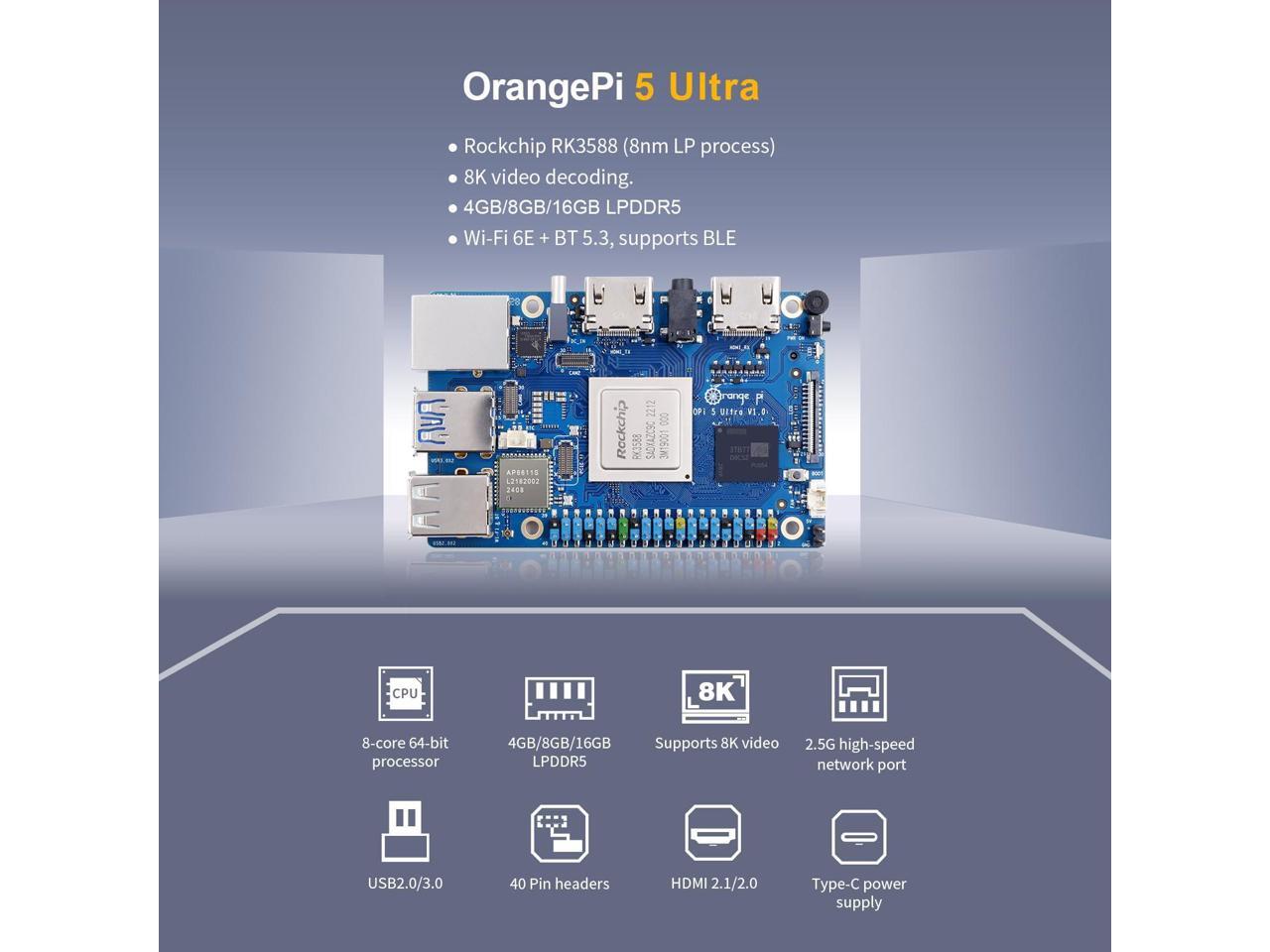 Orange Pi 5 Ultra 4GB/8GB/16GB LPDDR5 Rockchip RK3588 8-Core 64-Bit Single Board Computer, Wi-Fi 6E/Bluetooth 5.3/BLE, Development Board Run Linux/Ubuntu/Debian/Android (8GB)