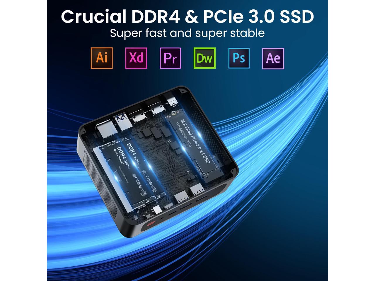 - [(32GB RAM 1TB NVMe SSD)] Mini Computer is equipped with high-speed 32G dual channel DDR4 and 1TB M.2 2280 PCIe 3.0 NVMe SSD((upgradeable to max 2TB) for faster command processing. Dual channel DDR4 upgradeable to max 64GB(2 x 32GB, up to 3200MHz). The Beelink mini pc can support powerful loading and processing capabilities for a smoother experience. If you need more storage space, you can also add a 2.5inch SSD (not included) to upgrade memory and expand storage to 2TB to suit your needs