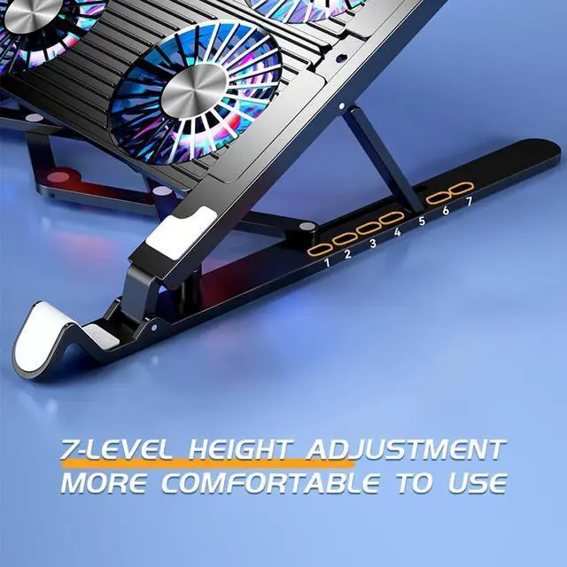 Ultra Quiet 4-core Fan with LED Lights: This laptop cooling pad is equipped with an ultra-quiet 4-core fan that provides powerful cooling while keeping a low noise level, allowing you to focus on work or entertainment without distractions. Additionally, the fan comes with LED lights that add a touch of fashion and technology to your using environment