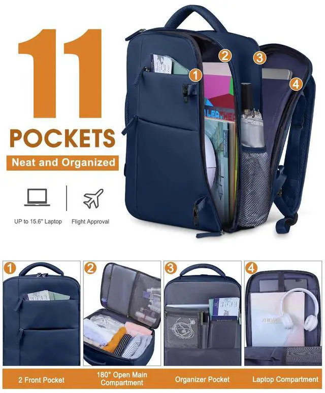 11 Pocket for Storage and Keep Organized:Rummaging your item in a messy backpack can be maddening. More pockets for better storage, helping you find what you want faster.180deg zipper closure Roomy main compartments with space for all your stuff, including 1 mesh pocket and 1 wet bag to keep your item neat and organized.2 zippered front bags can be used to store keys and cards.1 Laptop compartment with an organizer pocket can be used to store notebooks, pens, earphones, and other small items