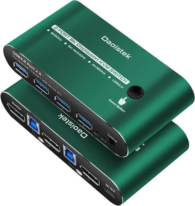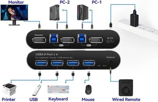 Kvm Switch 1 Monitors 2 Computers dp 144hz: KVM Switch Displayport 2 Computers 1 Monitor sharing one set of keyboard & mouse, 1 DP2.0 or DP 1.4 monitor, and 2 pcs USB 3.0 peripheral devices. 2 pcs USB 3.0 hub (data transferring rate up to 5Gbps/s ,10 times faster than USB 2.0), 2 kits cables and a wire remote push button switch.