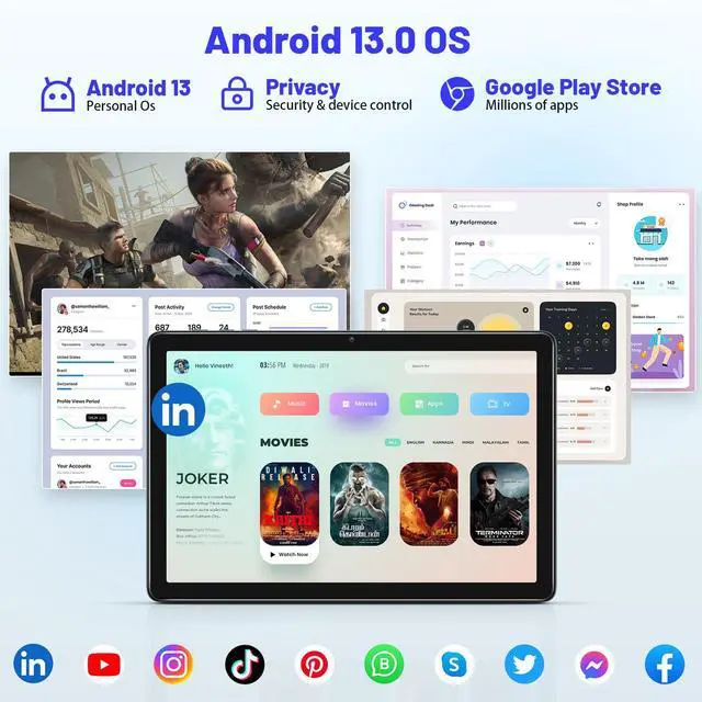 [(Expandable Storage & Long Battery Life)] The Android 13 tablet comes with 128GB ROM and expandable storage of up to 512GB, which offers ample space for your photos, music, movies, and videos. Equipping a 6800mAh high battery capacity that can provide 5+ days of ultra-long standby time, making it a good choice for commuting, travel, and entertainment.