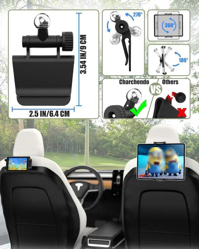 Charchendo for Tesla Model Y Model 3 Headrest Tablet Mount with Metal Ball Head Fits 4-13'' Devices, Car Back Seat iPad Holder Kids Adjustable Travel for iPad 12.9, Tablet, Phone, Switch, Fire HD 10