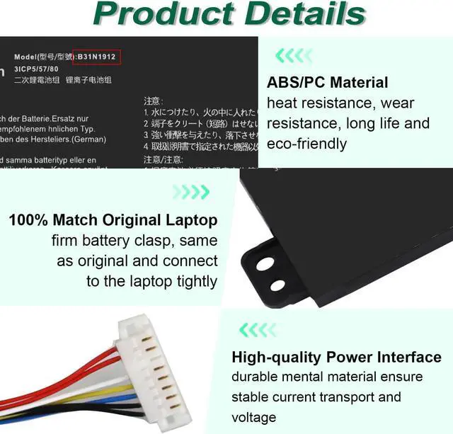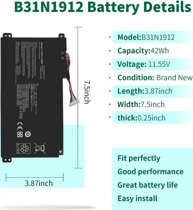 Specifications: Battery Model: B31N1912 31CP5/57/80, Battery Type: Li_ion, Voltage: 11.55V Capacity: 42Wh ; Cells: 3-cell; Color: Black ,Condition :New,Packages includes: 1x B31N1912 Battery,2 x Screwdrivers,1x Instruction for B31N1912 Laptop Battery