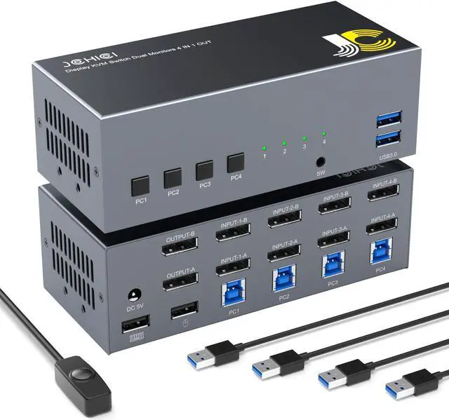 [(Dual-Monitor KVM Switch for 4 Computers with DisplayPort)] This DisplayPort KVM switch allows you to seamlessly control up to four computers using just one keyboard, mouse, and two monitors. With support for both mirror and extended display modes, it offers more flexibility and efficiency than traditional single-monitor KVM switches. (Note: Each computer must have two DisplayPort outputs and support extended display. HDMI/VGA/DVI/USB-C to DisplayPort adapters are compatible, but dual display functionality may be limited if your computer only supports single display output.)