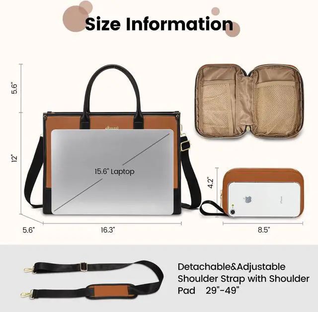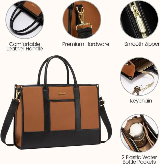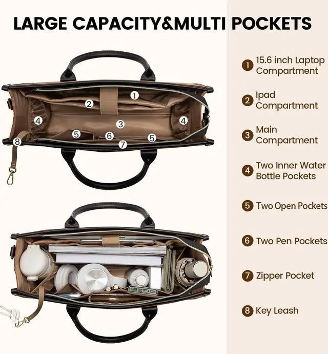 Effortless Organization & Ample Space: This stylish laptop bag for women (Dimensions: 16"L x 12"H x 5.6"W) is designed to cater to your organizational needs. Laptop purse boasts well-padded compartments perfectly suited for A4 documents, folders, a 15.6" laptop, and a 13-inch tablet, ensuring their safety during transport. With specialized pockets for water bottles and umbrellas, along with a convenient keychain holder, everything has its dedicated place.