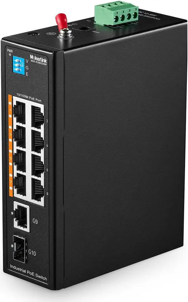 MokerLink 10 Port PoE Industrial Din Rail Switch, 8 Ports PoE+ 100Mbps IEEE 802.3 af/at, 1 Gigabit Ethernet and 1 SFP Uplink, Vlan & Extend Mode, DIN-Rail & Wall Mount