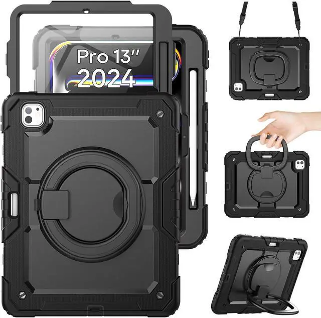 SCSVPN Case for iPad Pro 13 inch M4 2024 (7th Generation) with Screen Protector - Pencil Holder - 360deg Rotating Stand/Handle - Shoulder Strap, Full Drop Shockproof Protective Silicone Cover (Black)
