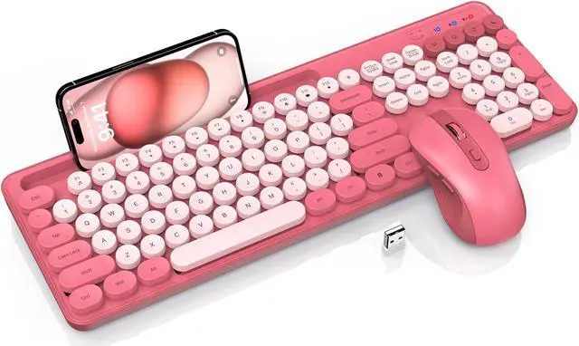 Wireless Keyboard and Mouse Combo, Retro Round Keycaps, Cute Full-Size Typewriter Keyboard with Phone Holder, Sleep Mode, Click Soft, 2.4GH z Cordless Connection for Windows/PC/Laptop (Pink-Colorful)