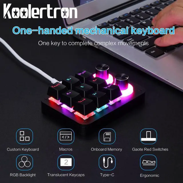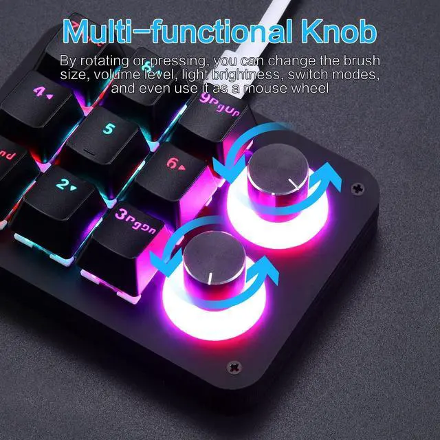 Rotate left and right can be infinitely rotated, can be set to volume, switch music previous/next, decrease/increase light brightness, switch light mode, turn pages forward/backward etc. you can carry it with you, effectively saving desktop space. ^^ Keyboard with Macro KeysThere are 16 buttons for advanced macro functions. Macro functions can be used in tandem and can support up to 349 key commands. Delayed commands can be added to meet various complex use cases such as: Office, CAD/Ae/Pr/Ps shortcuts, various user accounts and passwords, game tricks, basic codes for programmers. For example, the Set button will trigger a series of actions such as "Ctrl + A 0.5 s Ctrl + C 0.5 s Ctrl + V", etc. ^^ 4-layer Custom ConfigurationBuilt-in MCU, after setting the keyboard keys, they can be stored in the keyboard's MCU without resetting the keyboard. 4 levels of configuration can be saved to handle multiple use cases. Not only for gamers, but also for many other types of users, including designers and video editors. Not only for gamers, but also for many other types of users, including designers and video editors. ^^ RGB Backlight KeyboardRGB backlight with multiple effects can be customized to the player's desired color. The backlight brightness can be adjusted/turned off. Dynamic effects can be summarized into 8, each dynamic light effect can be adjusted to 3 different speeds; In addition, you can adjust 30 levels of brightness, 32 levels of saturation, and 32 different colors (including 32 static monochrome and 32 static color) in the light effect.