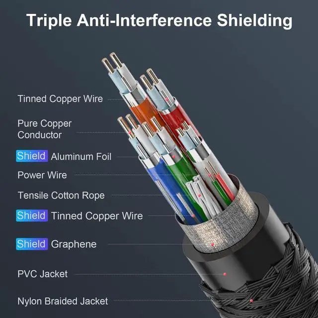 Super Anti-Interference CapabilityDP to DP cable features a 28AWG pure copper core, triple shield and PVC braid jacket. The graphene shield provides superior EMI resistance. The dp 2.1 cable ensures stable signal transmission without worrying about artifacts and audio/video synchronization.