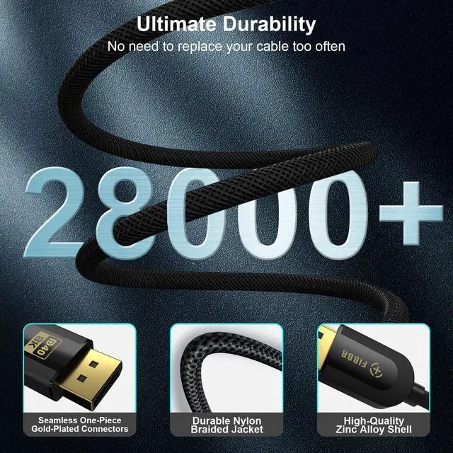 40Gbps Display Port Cable 2.1FIBBR display port to display port cable is VESA certified, and backward compatible with Display Port 2.0/1.4/1.3/1.2. Displayport 2.1 cable support transmission speeds of up to 40Gbps bandwidth for stable, high-speed transmission without signal loss.