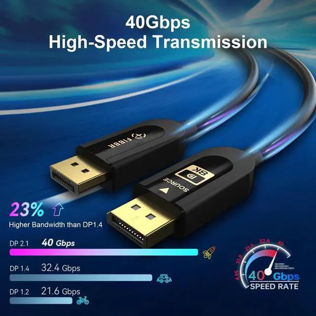 40Gbps Display Port Cable 2.1FIBBR display port to display port cable is VESA certified, and backward compatible with Display Port 2.0/1.4/1.3/1.2. Displayport 2.1 cable support transmission speeds of up to 40Gbps bandwidth for stable, high-speed transmission without signal loss.