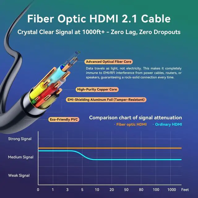 3D Audio-Visual DTS: X & Dolby Audio. Offers enough bandwidth for the most demanding home theater and gaming setups(next-gen consoles) ^^ Zero Interference & No Signal LossUtilizing advanced YOFC fiber optic technology, this hdmi fiber optic cable 30 foot converts electrical signals to light, ensuring stable high-speed data transmission even over 1000ft without any degradation, freezing, or dropouts. Immune to EMI/RFI interference, perfect for running alongside power cables. ^^ Lightweight & Flexible Active hdmi cable compared to thick and heavy copper cables, our fiber optic HDMI cable is 50% thinner, lighter and flexible than copper cables, making installation through walls and conduits much easier ^^ Unleash Your Gaming Edge30ft hdmi cable dominate in 4K @ 120Hz with zero lag or tearing. Our 30 foot hdmi cable delivers every pixel perfectly, fully unlocking your PS5 or Xbox Series X. Get the split-second advantage and total immersion with flawless, artifact-free visuals. This is the ultimate long hdmi cable 30 ft for competitive gamersyour key to victory ^^ Perfect for Home Theater ProsRoute this 30 ft hdmi through your walls or ceiling to connect your basement projector to your media center without signal loss ^^ The IT Manager's SolutionOur hdmi cable 30ft ensure flawless presentations in your conference rooms and lecture halls with a reliable, long-distance cable ^^ Ideal for IntegratorsOur thin, flexible, and immune to interference 30 ft hdmi cable 4k ultra high speed is exactly what you need for custom whole-home AV installations ^^ Wide CompatibilityOur 30 foot hdmi perfect for connecting 4K/8K TVs, projectors, soundbars, gaming consoles (PS5, Xbox Series X/S), Blu-ray players, and PCs to your display devices over long distancesCompatibility Note for LG