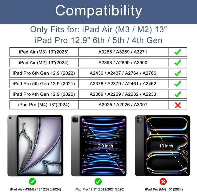 Designed for iPad Air 13" M3 M2 & iPad Pro 12.9" M2 - Exclusively for iPad Air 13 Inch 2025/2024 (Model No.: A3268/ A3269/ A3271; A2898 / A2899 / A2900); iPad Pro 12.9 6th gen 2022 (Model No.: A2436 / A2764 / A2437 / A2766); iPad Pro 12.9 5th/4th gen