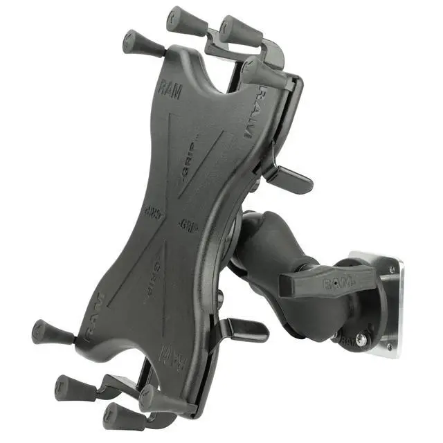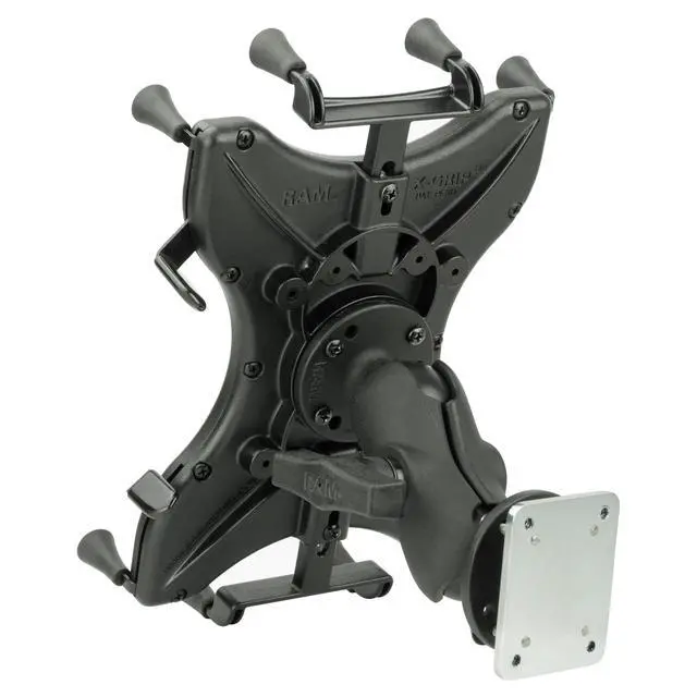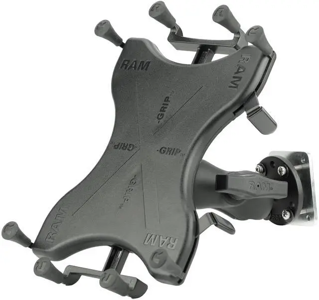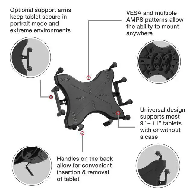 Spring-loaded 'X' design with rubber caps sports great holding power without obstructing your tablet; fits most 9"-11" tablets ^^ Drill-down mounting solution; choose either round plate featuring the AMPS hole pattern for attachment to compatible device holders ^^ 2.10" x 2.60" steel backing plate attaches to a variety of RAM Mounts ball bases ^^ Made of high-strength composite and steel components for durability and reliability in the most demanding environments ^^ Backed by a lifetime warranty