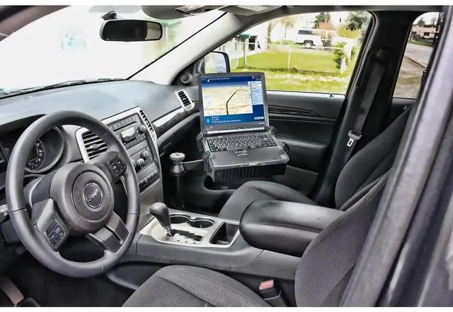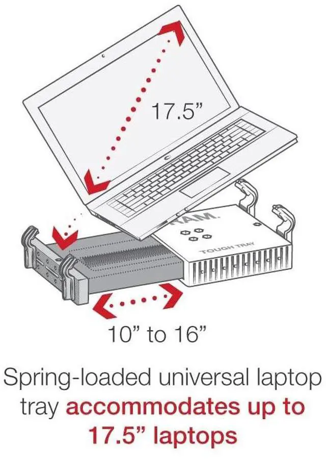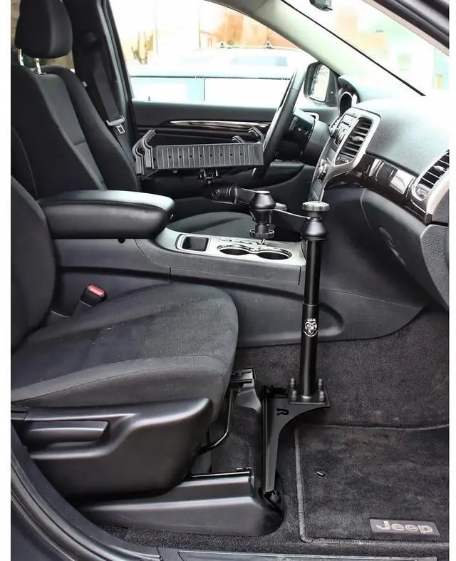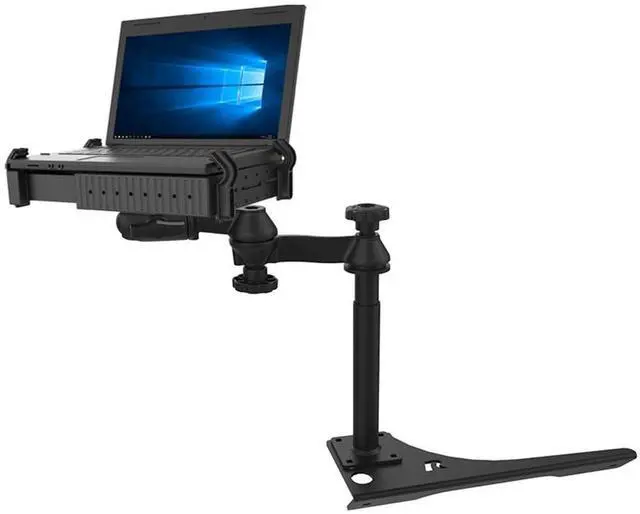 RAM Mounts No-Drill base offers low-profile mounting; telescoping pole allows for height adjustments ^^ Dual articulating swing arm allows for ideal placement; universal laptop tray accommodates most laptops ^^ Made of powder-coated steel and marine-grade aluminum ^^ Backed by a lifetime warranty
