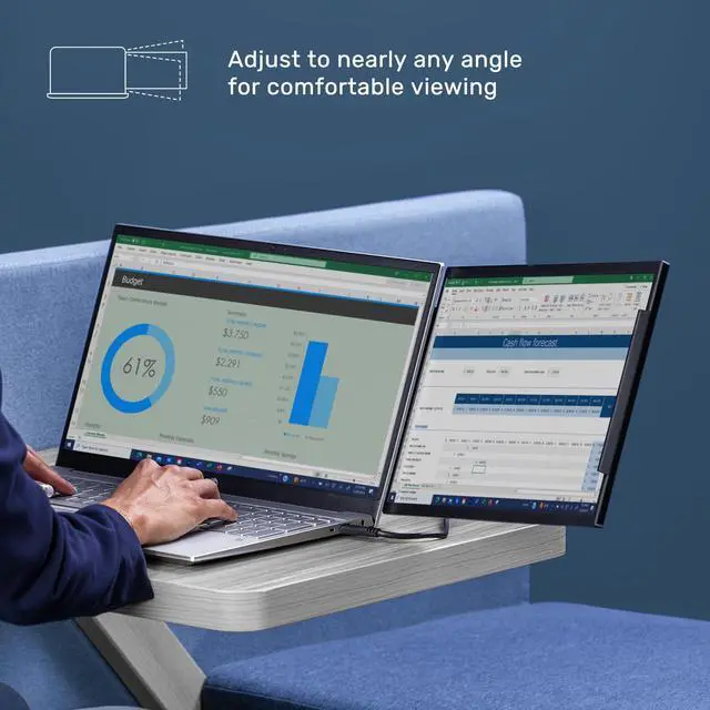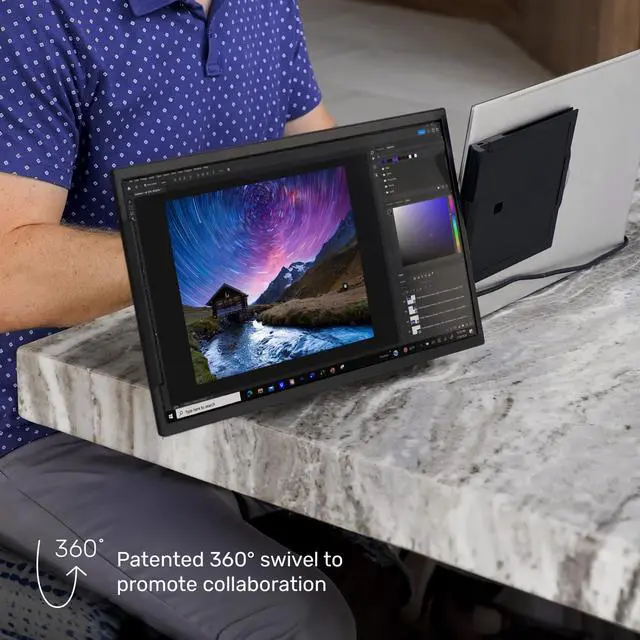 Patented 360° Swivel Hinge The patented swivel hinge offers 360° swivel and 270° rotation, allowing you to adjust the attachable monitor to your preferred angle. Effortlessly switch between shared views and personal setups, perfect for collaboration or multitasking with your dual monitor setup.
