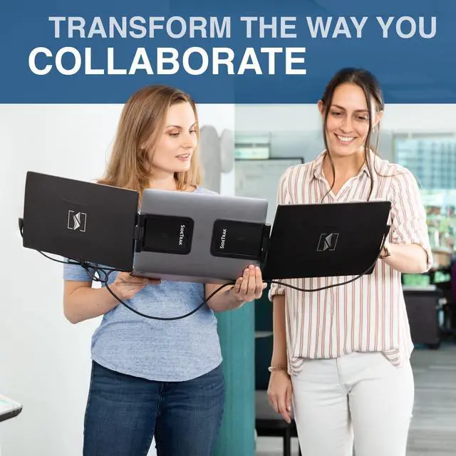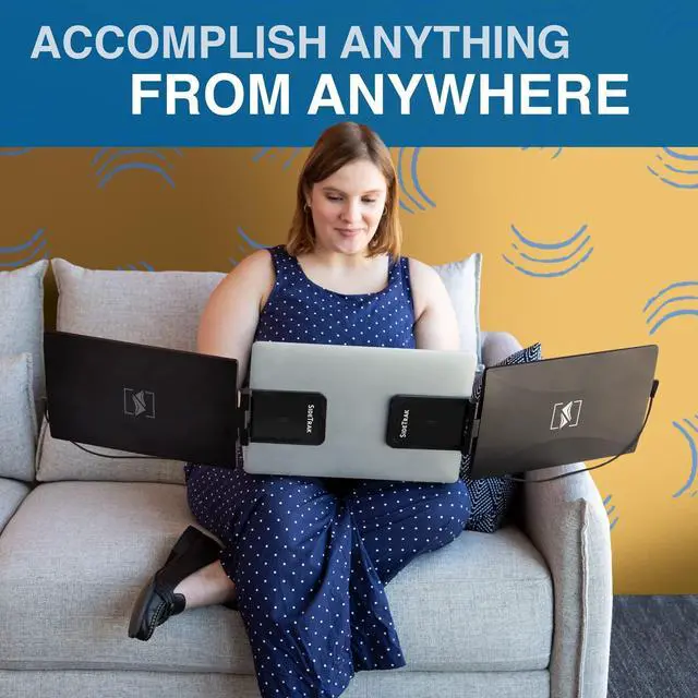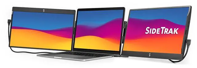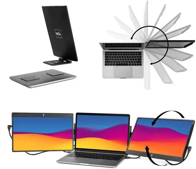 It allows you to move from room to room without having to dismantle your setup, making it ideal for travel. When youre on-the-go, simply close one monitor onto the back of your laptop and travel with the second monitor separately. ^^ Compatibility - These portable monitors requires no download and are compatible with most devices and operating systems, including Mac, PC, and Chrome. They connect via Thunderbolt or DisplayLink USB-C port, with other port types requiring a USB-A and HDMI connection. Its innovative attachment fits any laptop size. ^^ Versatile and Flexible - The SideTrak Swivel extends your screen for improved multitasking, or mirrors your display for impressive presentations.