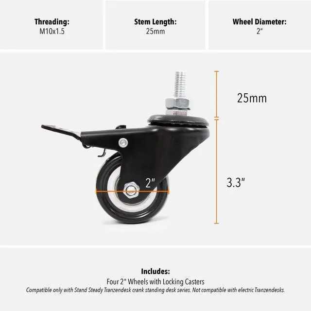 COMPATIBLE WITH TRANZENDESKS: These easy-glide wheels are the perfect add-on accessory to your manual Stand Steady Tranzendesk standing desk! Not compatible with electric Tranzendesks ^^