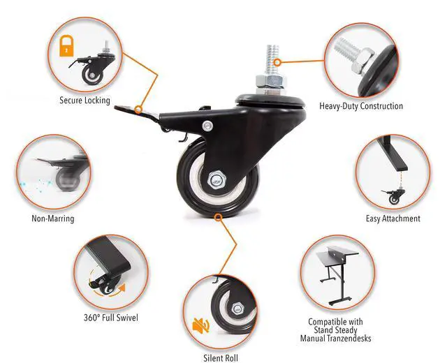 EASY ATTACHMENT: Make your Tranzendesk mobile in minutes with these easy-attaching wheels. Simply remove the leveling feet and twist on the Stand Steady wheels ^^