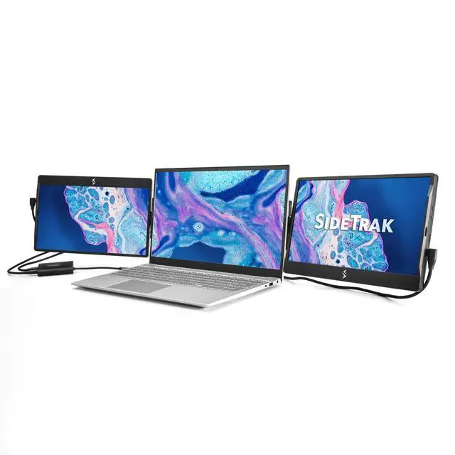 Triple Screen Laptop Setup Instantly triple your laptop screen workspace with this innovative attachable monitor setup. The SideTrak Swivel 12.5" is designed for easy setup, securely attaching to the back of any laptop. It delivers the productivity of a triple monitor setup with the portability of a laptop without the need for complex installations or technical knowledge. ^^ Patented 360 Swivel Hinge for Maximum Flexibility Our patented hinge offers a full 360 swivel and 270 screen rotation, allowing you to adjust the laptop screen extender for optimal viewing angles. This design ensures a versatile and comfortable setup, perfect for collaboration or screen sharing.