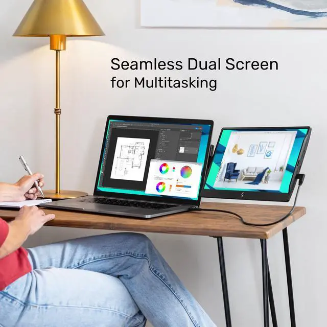 360 Patented Swivel Hinge for Maximum Comfort and Collaboration The patented 360 swivel hinge allows you to adjust the portable monitor to your preferred angle for comfortable viewing. Rotate it 180 for easy screen sharing and collaboration during meetings, making your dual monitor setup versatile and productive. ^^ Dual Screen for Enhanced Productivity Extend your laptop display for seamless multitasking with this laptop screen extender. The portable screen for laptop fits most laptops and can be customized to sit on the right or left side, freestanding or attached. ^^ Attachable & Aesthetic Design Securely attaches to your laptop with a device-safe magnet, eliminating the need for extra desktop or table space and making travel easy.