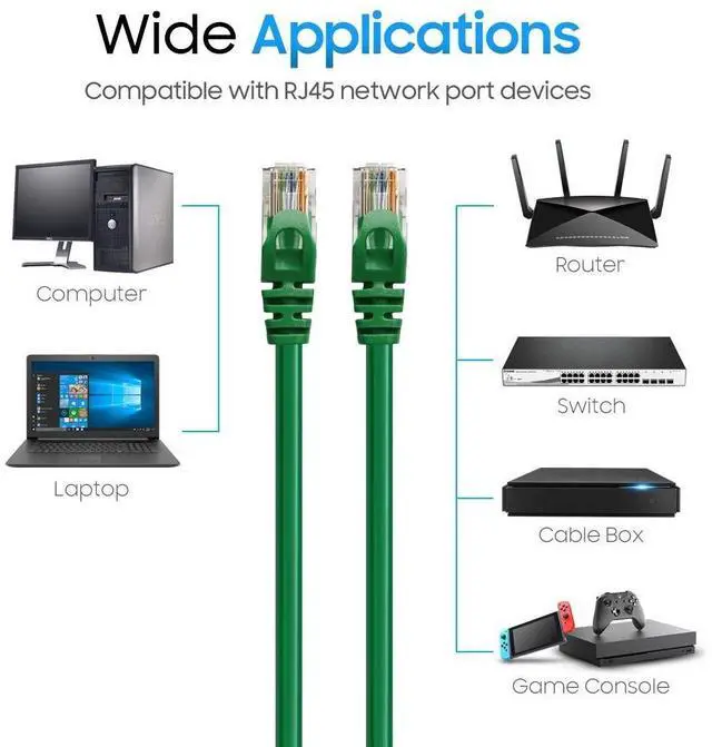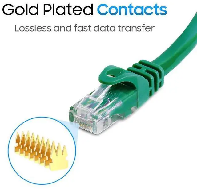 Pack of 5 - Cat6 500MHz UTP Ethernet LAN Network Cable? 10FT Green High-performance Cat6 ethernet patch cables are designed with extremely well-matched components for outstanding and very low return loss, providing lower crosstalk, and a higher signal-to-noise ratio. They support frequencies of up to 550 MHz and are suitable for high-speed 10Gbps internet connection. Cat6 Ethernet patch cable provides universal connectivity for everything from computers, printers, servers, routers, and switch boxes to network media players, network-attached storage devices, VoIP phones, IP cameras, gaming consoles, Ethernet extenders, PoE devices, and more Our Cat6 cables are designed extremely well with precision twisting, rigorous research, and testing, resulting in higher bandwidth.